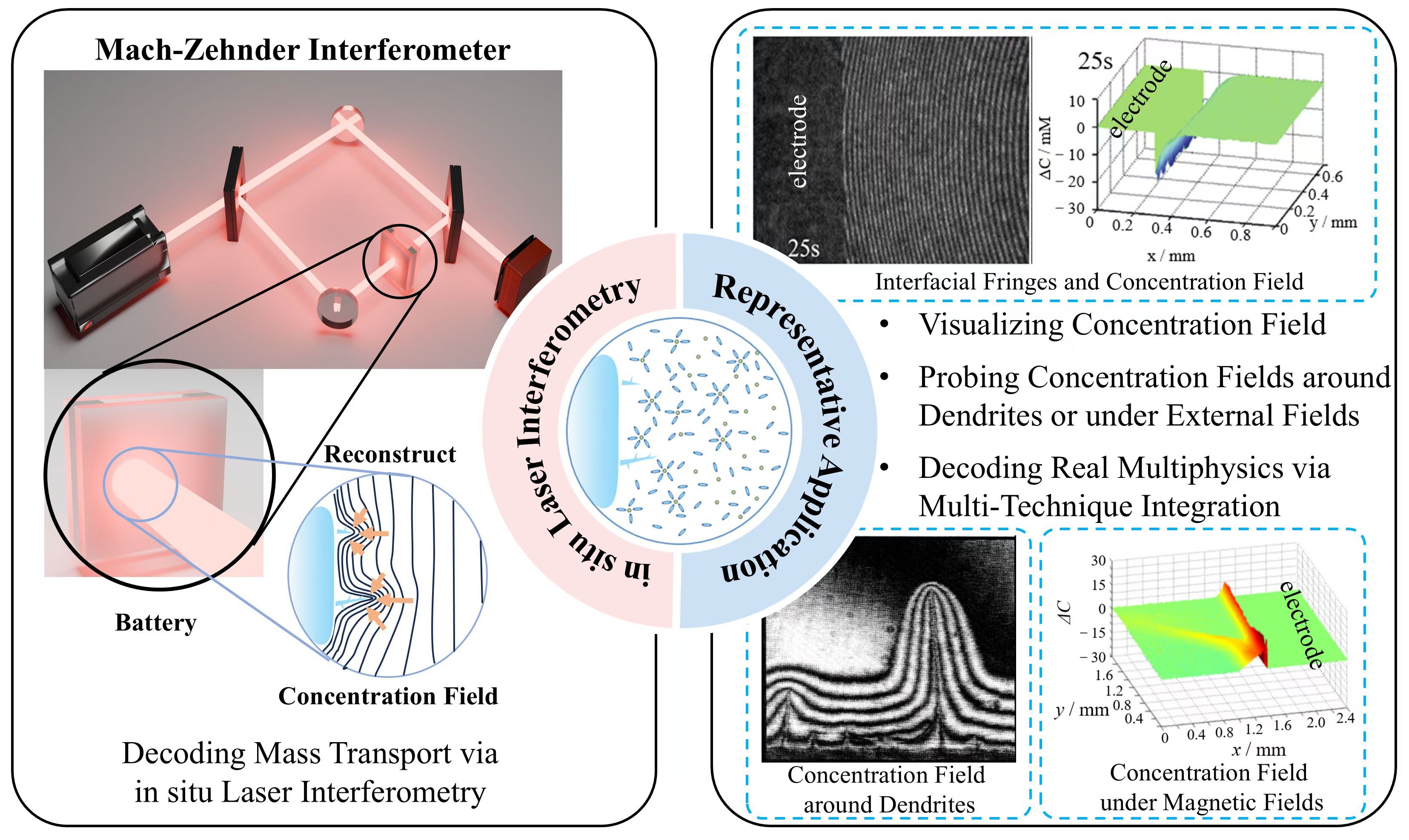 Probing ion transport dynamics at electrode-electrolyte interfaces is essential for advancing electrochemical energy technologies. Among various diagnostic methods, laser interferometry stands out as a label-free, non-invasive optical technique with high spatiotemporal resolution, which is uniquely suited for in situ visualization of interfacial concentration fields. This work outlines the fundamental optical principles and system configurations of laser interferometry, including Mach–Zehnder interferometers and digital holography. Key data processing strategies for concentration field reconstruction are presented, including fringe shift analysis, phase-shifting interferometry, and digital holography. Representative applications are discussed, with a focus on interfacial concentration evolution, metal electrodeposition and dendrite growth, and mass transport under magnetic or convective effects. By bridging optical interferometry with electrochemical interface science, this work provides a comprehensive methodological framework and offers practical guidance for researchers exploring mass transport phenomena and optimizing the performance of electrochemical systems.